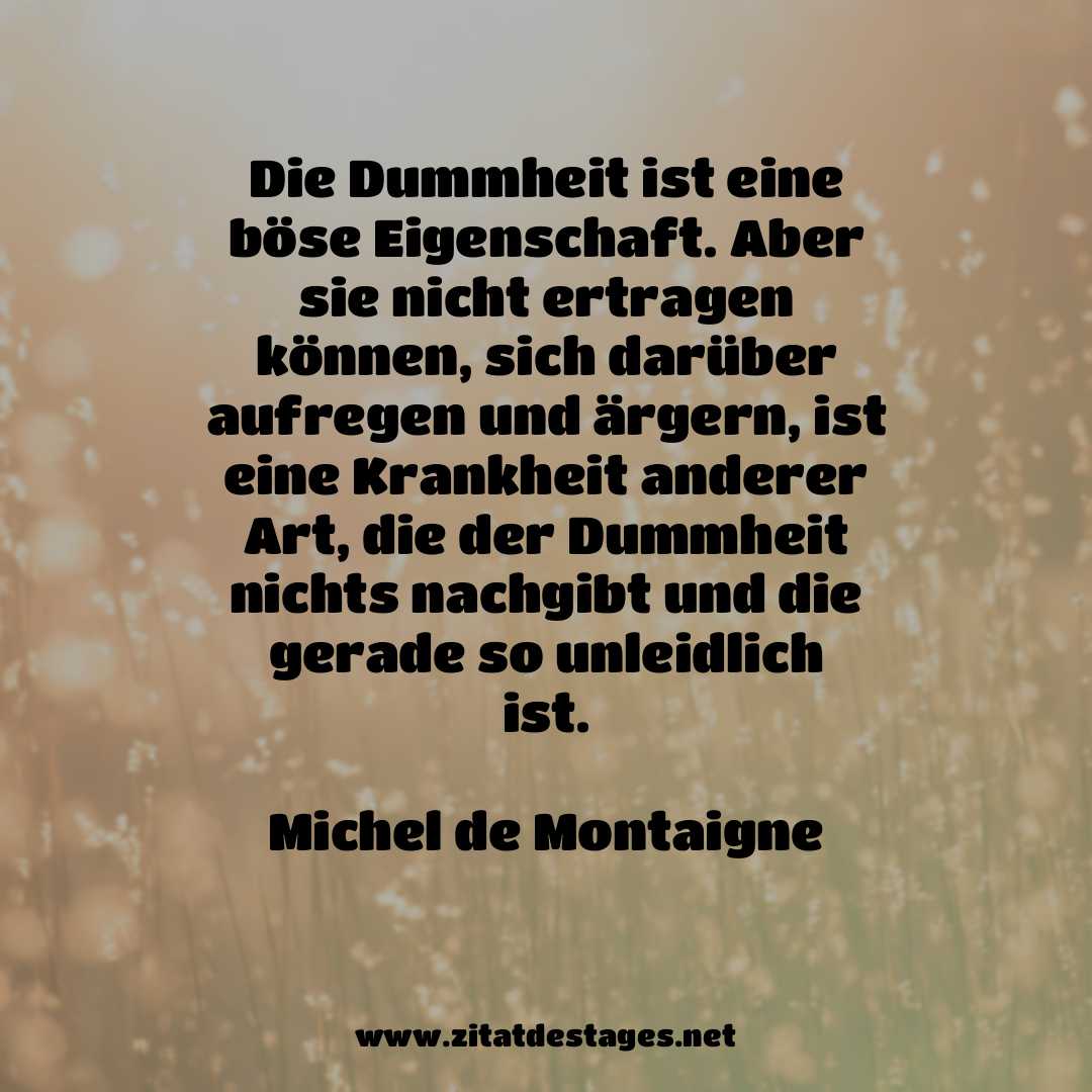 Unser heutiges Zitat des Tages ist: „Die Dummheit ist eine böse Eigenschaft. Aber sie nicht ertragen können, sich darüber aufregen und ärgern, ist eine Krankheit anderer Art, die der Dummheit nichts nachgibt und die gerade so unleidlich ist.“ (Michel de Montaigne)