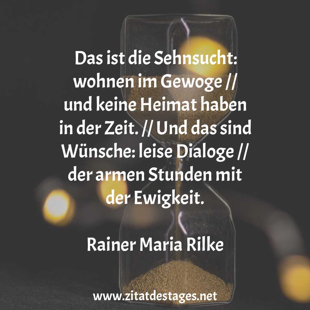 Heute wäre Rainer Maria Rilke 150 Jahre alt geworden! Rainer Maria Rilke wurde am 04.12.1875 geboren. Das heutige Zitat des Tages ist daher: „Das ist die Sehnsucht: wohnen im Gewoge // und keine Heimat haben in der Zeit. // Und das sind Wünsche: leise Dialoge // der armen Stunden mit der Ewigkeit.“ (Rainer Maria Rilke)