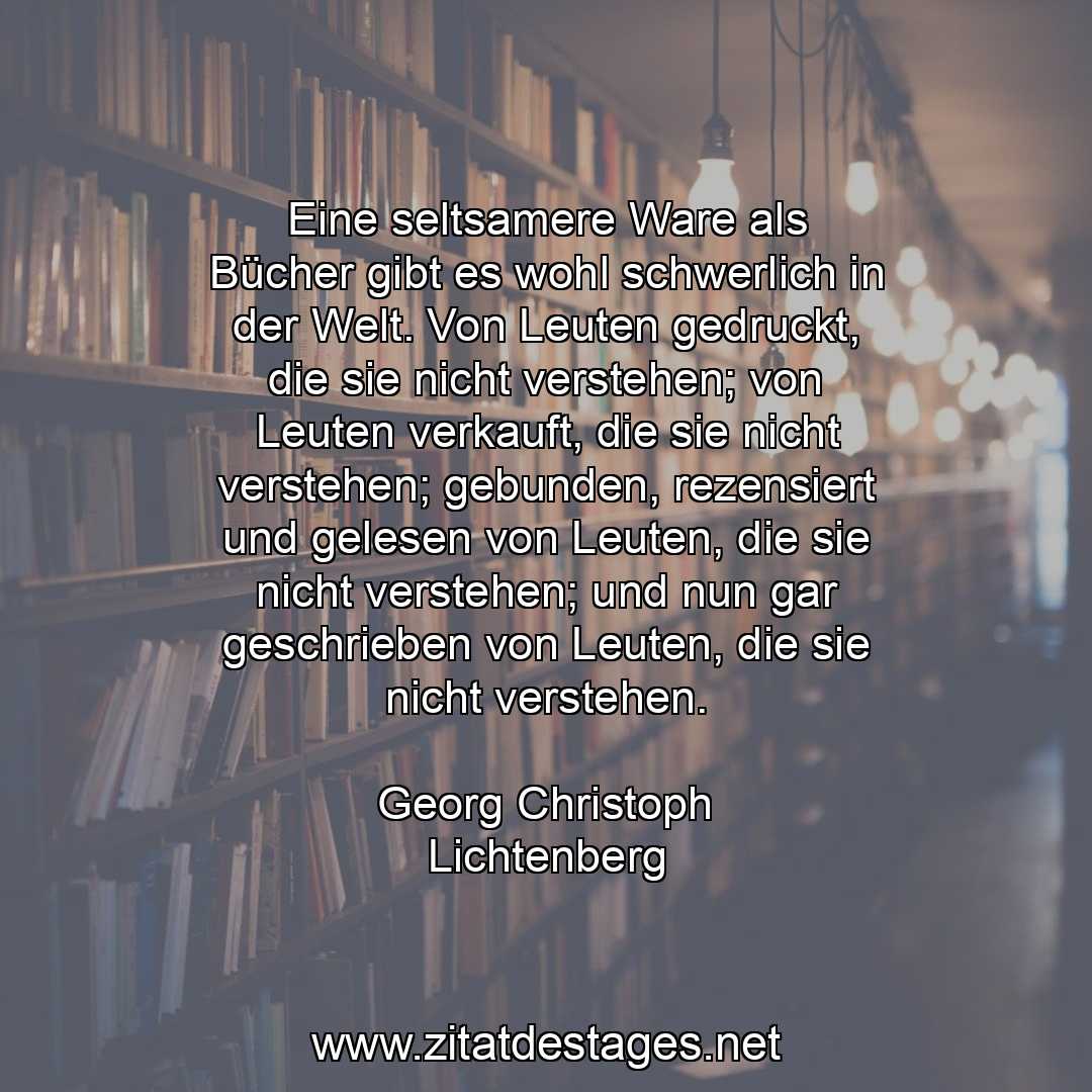 Unser heutiges Zitat des Tages ist: „Eine seltsamere Ware als Bücher gibt es wohl schwerlich in der Welt. Von Leuten gedruckt, die sie nicht verstehen; von Leuten verkauft, die sie nicht verstehen; gebunden, rezensiert und gelesen von Leuten, die sie nicht verstehen; und nun gar geschrieben von Leuten, die sie nicht verstehen.“ (Georg Christoph Lichtenberg)