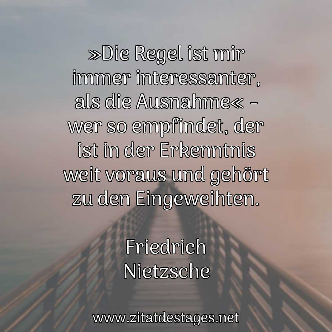 Unser heutiges Zitat des Tages ist: „»Die Regel ist mir immer interessanter, als die Ausnahme« – wer so empfindet, der ist in der Erkenntnis weit voraus und gehört zu den Eingeweihten.“ (Friedrich Nietzsche)