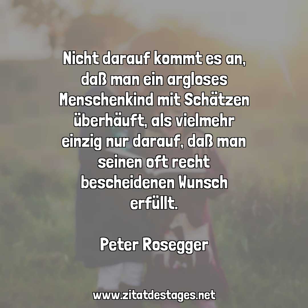Unser heutiges Zitat des Tages ist: „Nicht darauf kommt es an, daß man ein argloses Menschenkind mit Schätzen überhäuft, als vielmehr einzig nur darauf, daß man seinen oft recht bescheidenen Wunsch erfüllt.“ (Peter Rosegger)