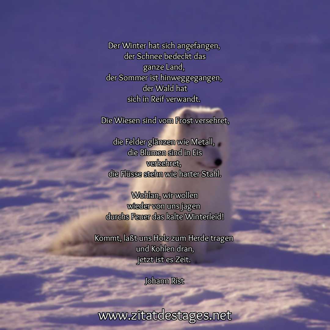 Das heutige Zitat des Tages lautet: „Der Winter hat sich angefangen, der Schnee bedeckt das ganze Land, der Sommer ist hinweggegangen, der Wald hat sich in Reif verwandt. Die Wiesen sind vom Frost versehret, die Felder glänzen wie Metall, die Blumen sind in Eis verkehret, die Flüsse stehn wie harter Stahl. Wohlan, wir wollen wieder von uns jagen durchs Feuer das kalte Winterleid! Kommt, laßt uns Holz zum Herde tragen und Kohlen dran, jetzt ist es Zeit.“ (Johann Rist)