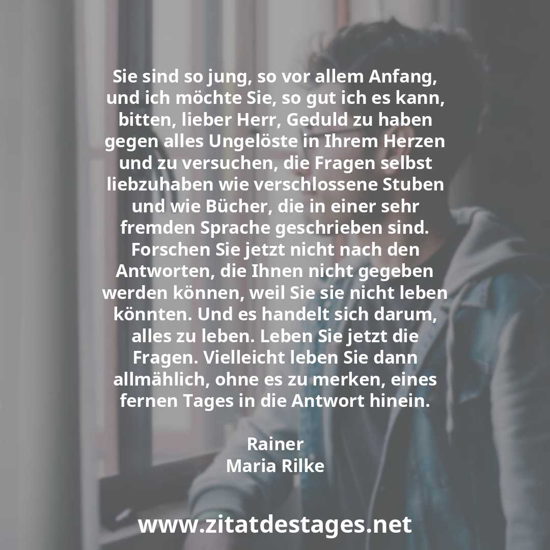 Unser heutiges Zitat des Tages ist: „Sie sind so jung, so vor allem Anfang, und ich möchte Sie, so gut ich es kann, bitten, lieber Herr, Geduld zu haben gegen alles Ungelöste in Ihrem Herzen und zu versuchen, die Fragen selbst liebzuhaben wie verschlossene Stuben und wie Bücher, die in einer sehr fremden Sprache geschrieben sind. Forschen Sie jetzt nicht nach den Antworten, die Ihnen nicht gegeben werden können, weil Sie sie nicht leben könnten. Und es handelt sich darum, alles zu leben. Leben Sie jetzt die Fragen. Vielleicht leben Sie dann allmählich, ohne es zu merken, eines fernen Tages in die Antwort hinein.“ (Rainer Maria Rilke)