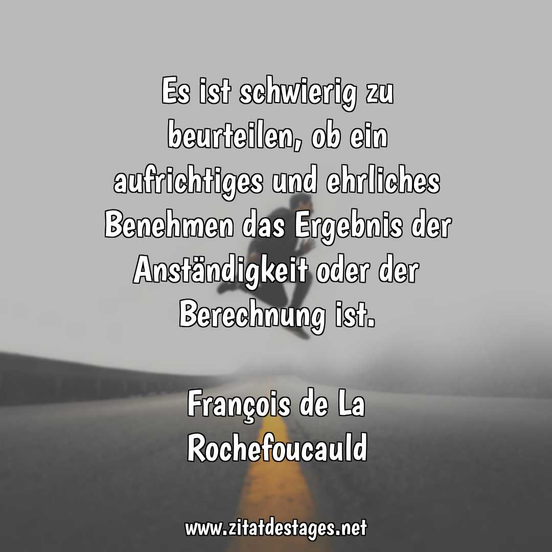 Das heutige Zitat des Tages lautet: „Es ist schwierig zu beurteilen, ob ein aufrichtiges und ehrliches Benehmen das Ergebnis der Anständigkeit oder der Berechnung ist.“ (François de La Rochefoucauld)