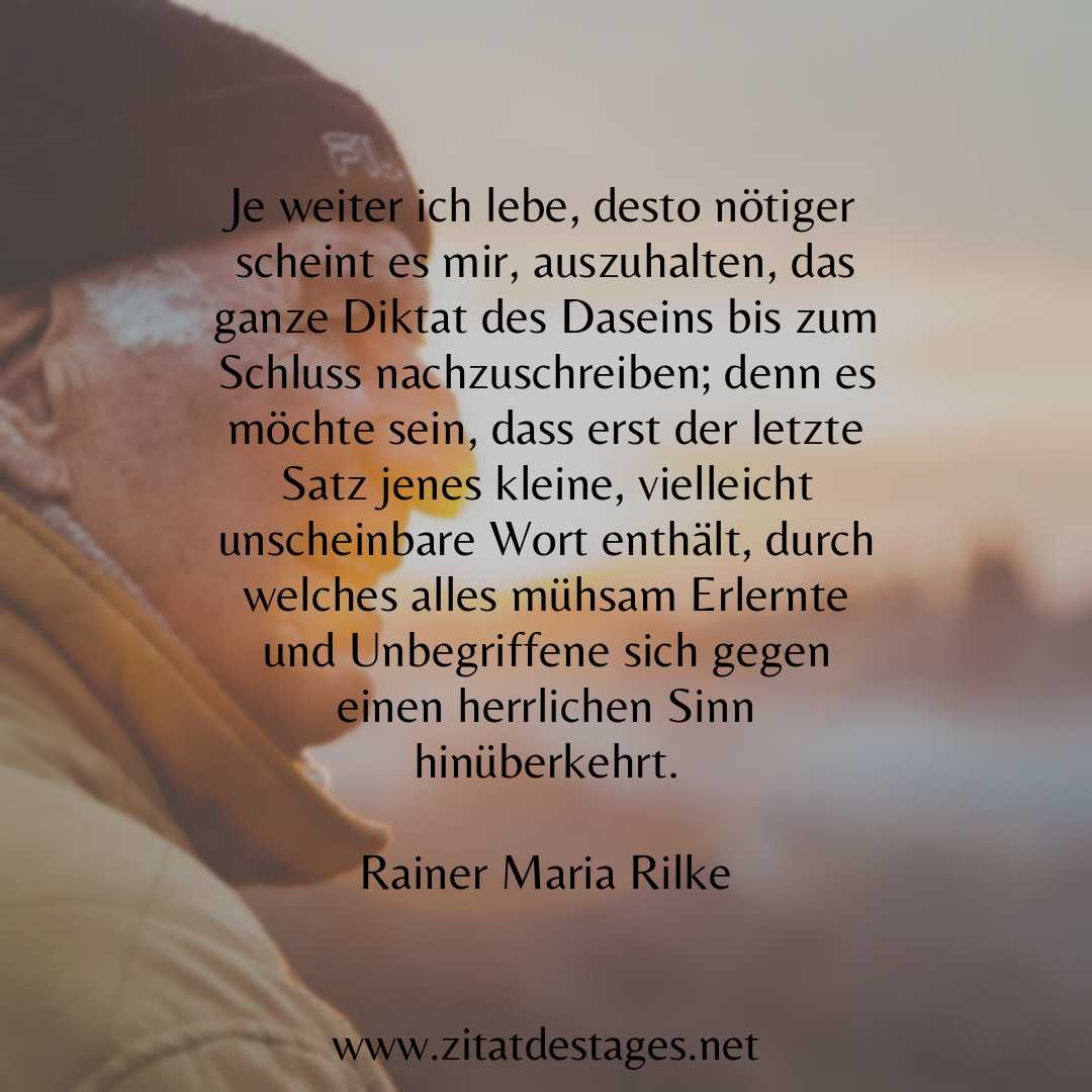 Heute vor 99 Jahren, am 29.12.1926, verstarb Rainer Maria Rilke! Rainer Maria Rilke wurde 51 Jahre alt. Das heutige Zitat des Tages ist daher: „Je weiter ich lebe, desto nötiger scheint es mir, auszuhalten, das ganze Diktat des Daseins bis zum Schluss nachzuschreiben; denn es möchte sein, dass erst der letzte Satz jenes kleine, vielleicht unscheinbare Wort enthält, durch welches alles mühsam Erlernte und Unbegriffene sich gegen einen herrlichen Sinn hinüberkehrt.“ (Rainer Maria Rilke)